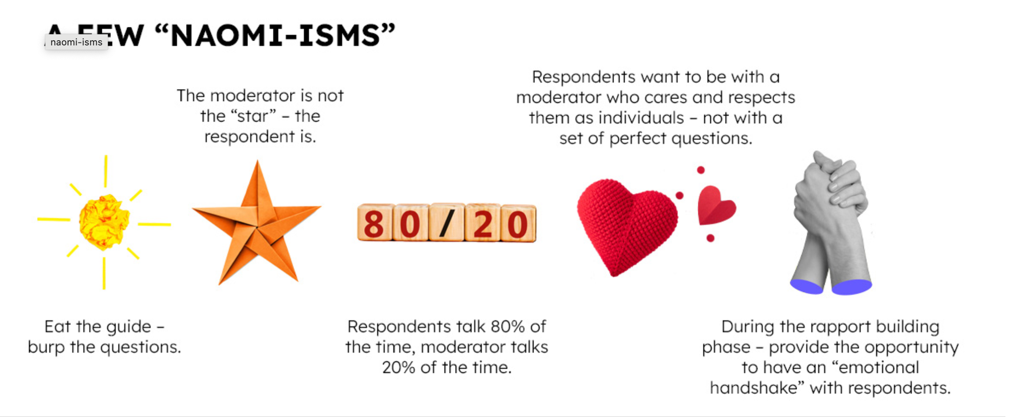 Naomi Henderson was a legend in the minds of many in the insights community and among the pioneers in the corporate qualitative research arena. If you were one of the lucky ones to have been her friend, attended one of her training courses, or watched her speak on a college campus, it was a guarantee that you left smiling from her jokes and down-to-earth nature...along with a notebook full of tips and ‘Naomi-isms’ on how to better conduct qualitative market research.